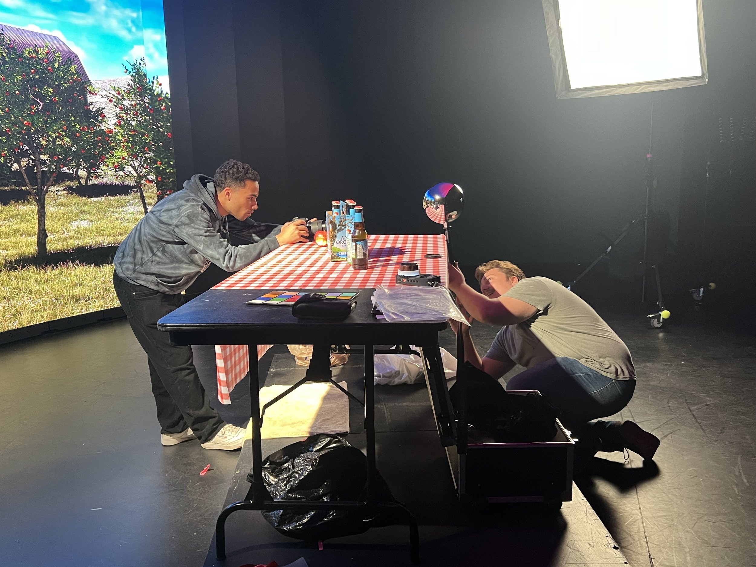 After many attempts, we finally were able to get access to the green room to shoot footage! We shot the footage for Shot 1 which is the can of Angry Orchard being placed and cracked open on a table triggering the transition to the orchard. We also shot placeholder footage for our updated Shot 7 which will be a man pouring Angry Orchard into a glass and walking off to reveal the logo motion graphic.