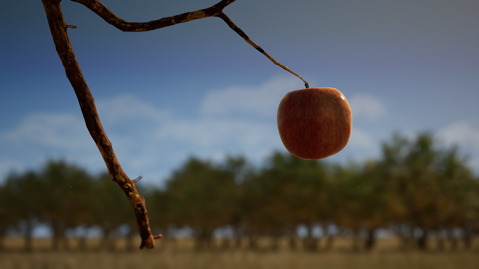 Hi-res screenshot taken with original tree mesh to the left. Fireflies can be seen on the background tree mesh just to the left of the apple. The new, low-poly mesh is on the right with no fireflies present.
