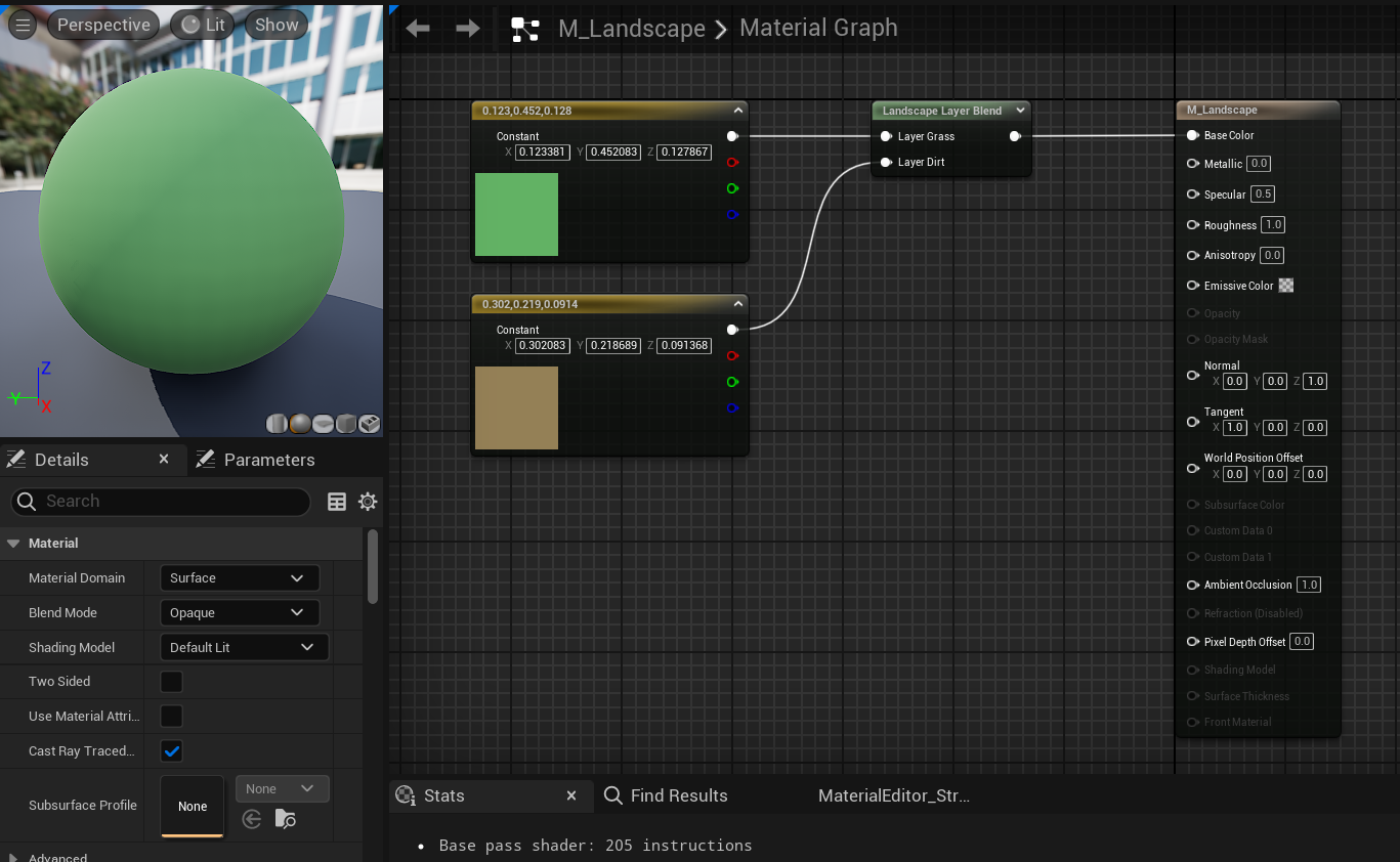 I set up the bare bones of a landscape material, so I could visualize how the different materials of the actual landscape will look in order to help with the block-out process. The green will become the grass material and the tan will become the dirt/soil material. Later when the refinement process starts these will be switched to their respective color maps and other texture maps, such as normal and roughness, will be applied too.